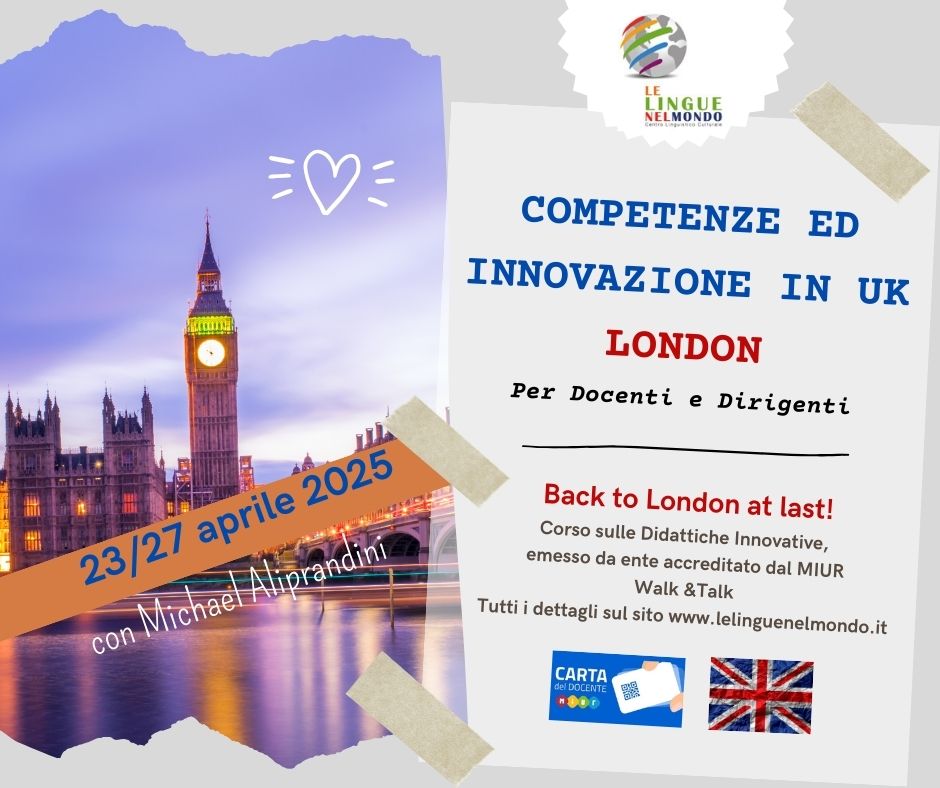 Dear Teachers: pronti per il viaggio a Londra? Noi non vediamo l’ora. È un piacere poter offrire un’opportunità di formazione accreditata dal MIUR. Ma non soltanto per docenti di lingua inglese! Anche per le altre lingue straniere e discipline, desiderosi di conoscere questa parte del Regno Unito e lavorare da … studenti, i vostri! Le attività proposte potranno poi essere riportate nelle classi. Da un’idea ne nasce un’altra! È sufficiente avere un livello almeno B1 di lingua inglese. Saremo con voi in questa avventura!