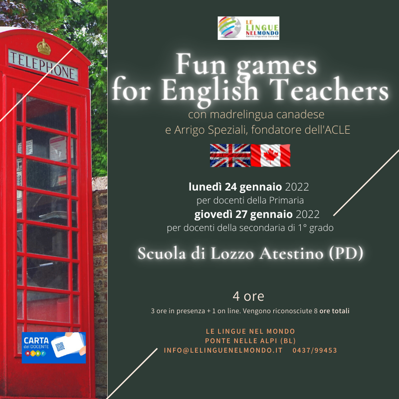 Costo del corso di 4 ore (3+1 e 8 riconosciute): € 30 saldabili con Carta Docente. Tessera associativa per i docenti offerta da Le Lingue nel Mondo, valida fino al 31.12.2022