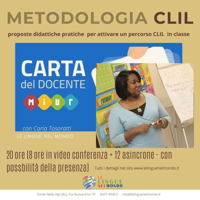 OBIETTIVI: introdurre la metodologia CLIL nella didattica, offrendo ai partecipanti la possibilità di acquisire e sperimentare conoscenze e strategie volte a pianificare una lezione/modulo CLIL in lingua inglese.